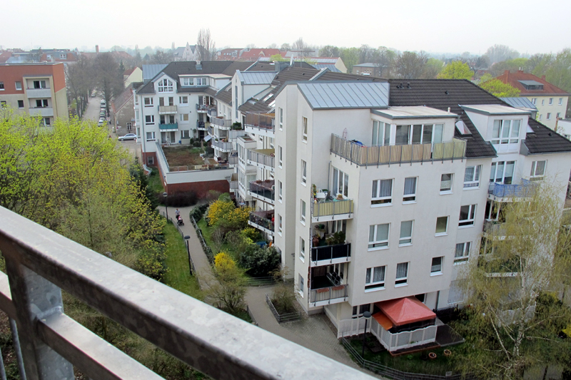 Der Blick vom 12m² großen Balkon führt über alle umliegenden Häuser nach Westen bis zum Fernsehturm. Sonne ab ca. 14 Uhr auf dem Balkon bis zum Sonnenuntergang über Berlin. Aus allen Fenstern geht der weite Blick ins Grüne und über die Dächer.